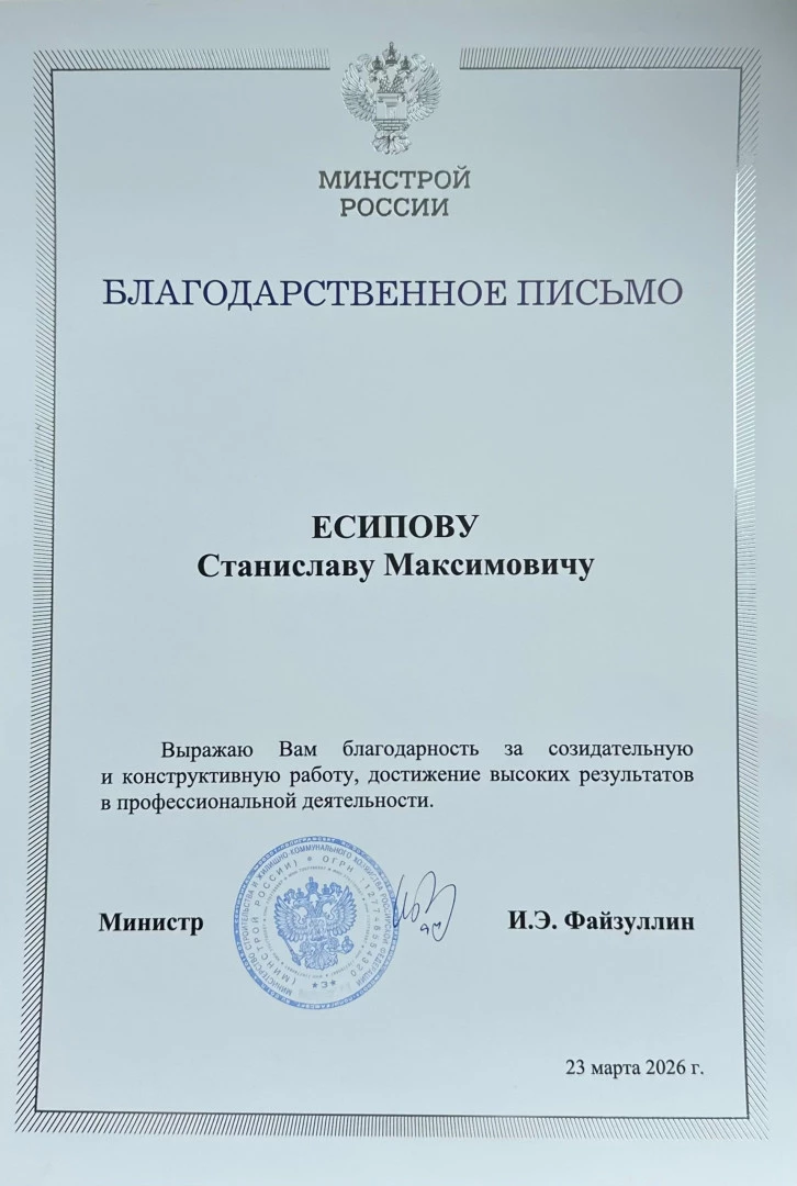 Заместитель заведующего кафедрой строительства и городского хозяйства БГТУ имени В.Г. Шухова, кандидат технических наук, доцент Станислав Есипов отмечен благодарностью Министерства строительства и жилищно-коммунального хозяйства РФ.