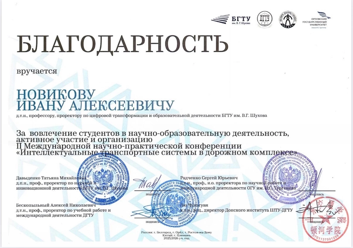 Значимость этой работы подтверждается и на уровне профессионального сообщества. Иван Новиков удостоен благодарности за вовлечение студентов в научно-образовательную деятельность, а также за активное участие и организацию II Международной научно-практической конференции «Интеллектуальные транспортные системы в дорожном комплексе».
