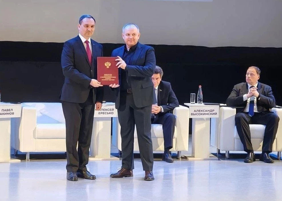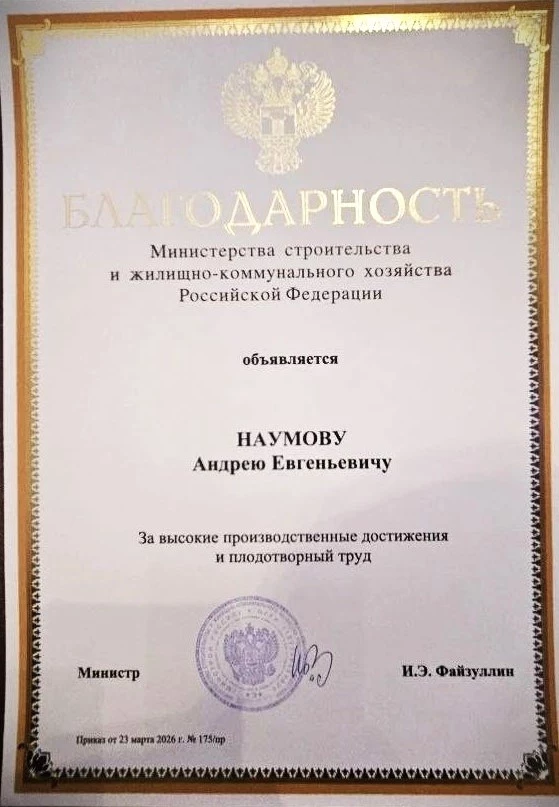 На торжественном открытии заместитель министра строительства и жилищно-коммунального хозяйства РФ Алексей Ересько вручил Андрею Евгеньевичу благодарность за высокие производственные достижения и плодотворный труд.