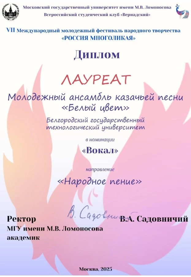 Завершен VII Международный молодёжный фестиваль народного творчества «Россия многоликая», организованный Студенческим союзом МГУ имени М. В. Ломоносова. В творческом форуме принял участие молодёжный ансамбль казачьей песни БГТУ «Белый цвет» (руководитель — Людмила Сушкова), и его солистка — студентка ИСИ Алина Сидорова.