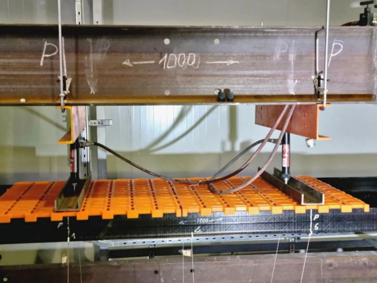Нагрузка создаётся с помощью спаренных гидравлических домкратов (силовых цилиндров) разной мощности — 40, 100 и 300 кН (килоньютонов). Объединяя их в общую систему, можно создать суммарное усилие до 600 кН. Такой мощности достаточно, чтобы испытать на изгиб вплоть до полного разрушения конструкции из большинства современных строительных материалов.